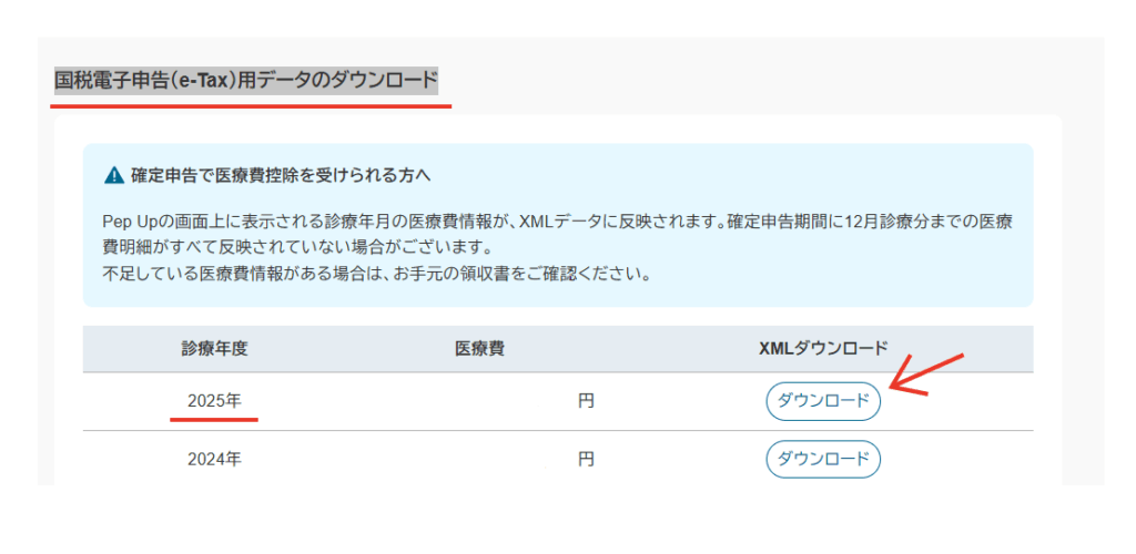 ★12月診療分のXML形式データへの反映は通常、翌年3月中旬以降となります。確定申告期間時点で未反映の医療費情報については、お手元の領収書でご確認ください